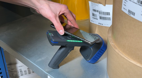 En RFID-slæde er et tilføjelsesmodul, der fastgøres til en smartphone eller en tablet og omdanner den til en professionel UHF RFID-læser.